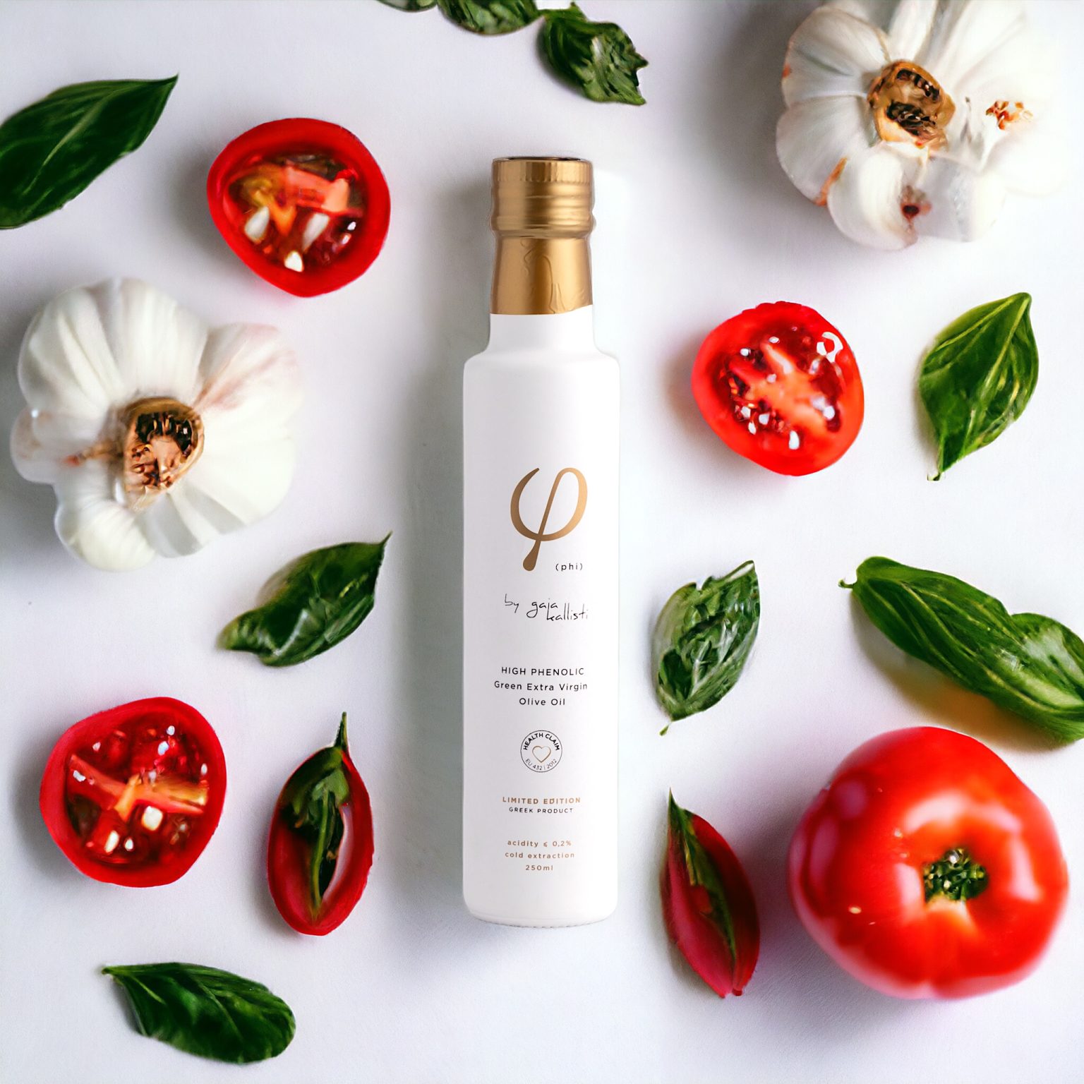 Gaia Kallisti prezintă cu mândrie Φ (phi), o capodoperă printre uleiurile de măsline extravirgine. Acest ulei de măsline extravirgin în ediție limitată este meticulos obținut prin extracție la rece, utilizând doar prima presare a măslinelor verzi necoapte din Halkidiki, culese manual. Rezultatul este un ulei de măsline extravirgin extraordinar, cu un conținut excepțional de ridicat de fenoli – peste 420 mg/kg – și cu un nivel de aciditate mai mic de 0,2%. Φ nu este doar o încântare culinară, ci și o dovadă a purității și excelenței.